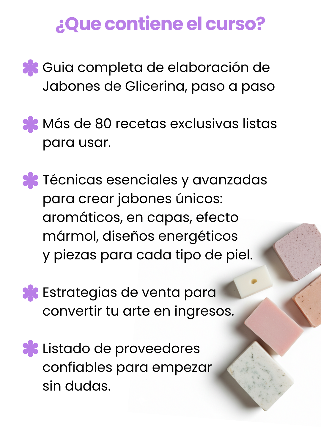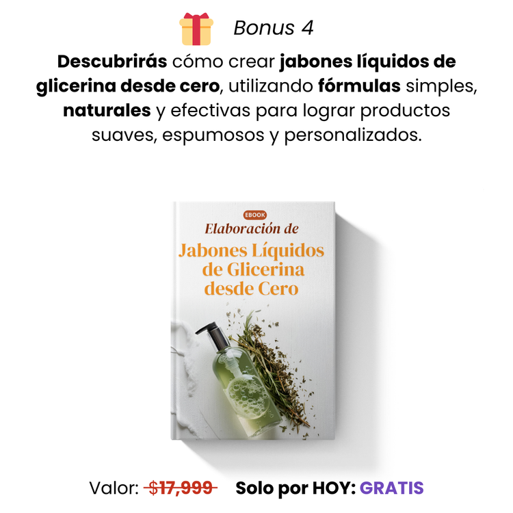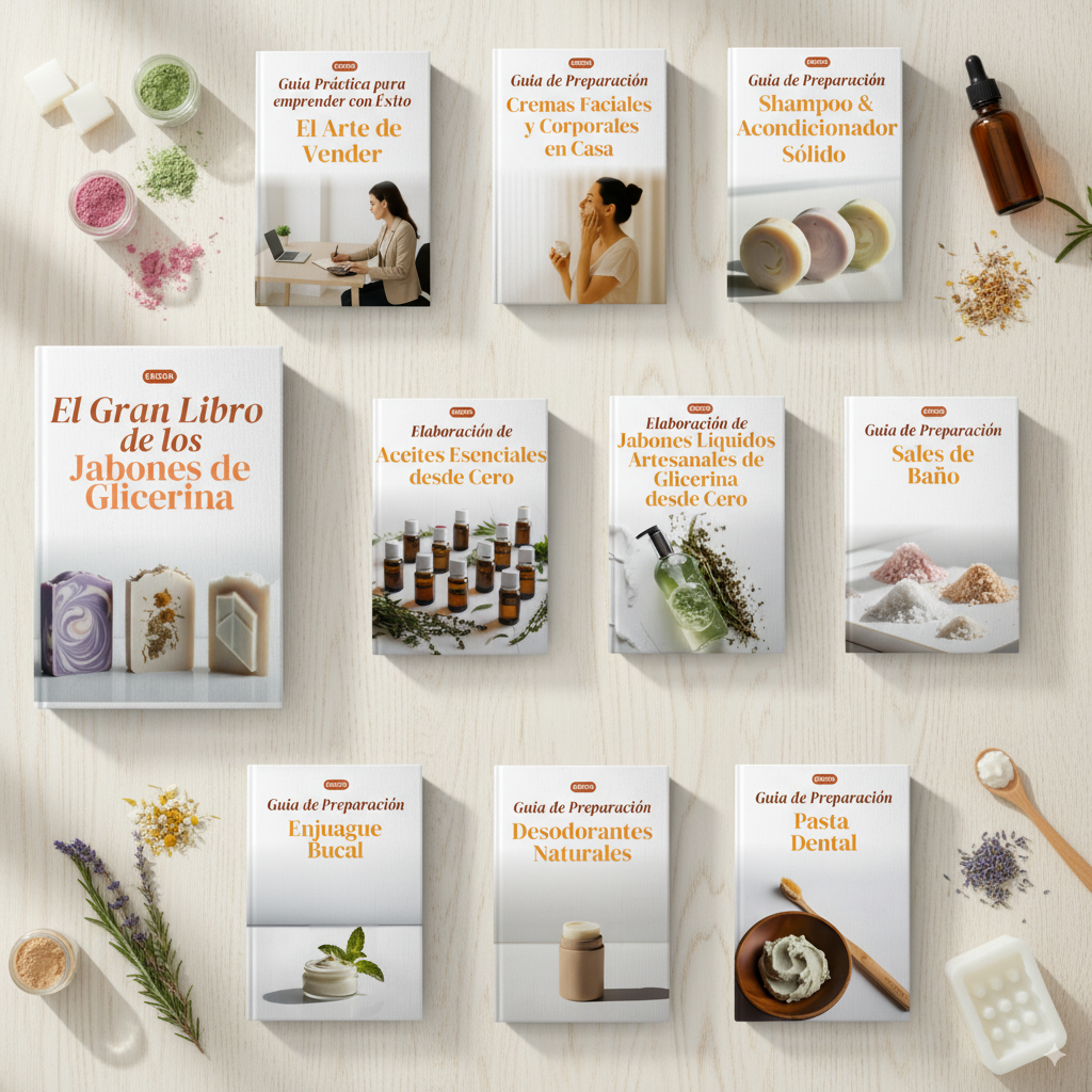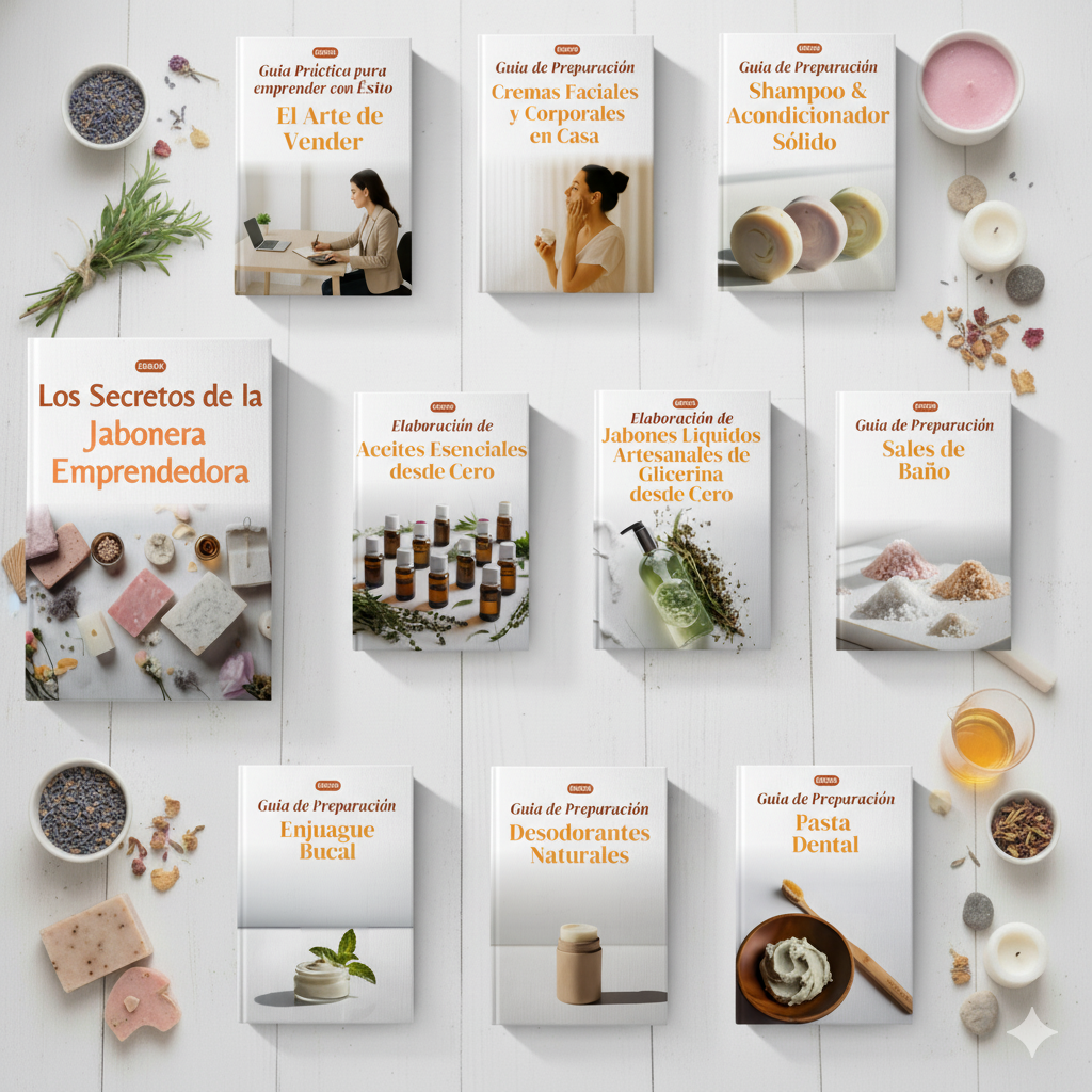 Recibís mucho más que un simple libro. Este es tu kit completo para arrancar un negocio de jabones ecologicos y naturales. Incluye recetas probadas, guías paso a paso para preparar y empezar a vender tus jabones rapidamente. Ah, y un bonus: ¡te damos un kit completo de cosmética natural para que amplies tu negocio y salud para tu familia!